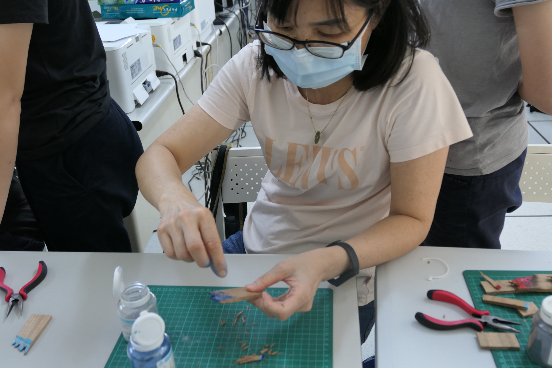 - 活動內容:學習線鋸機之使用,並進行木材融入複合式媒材之實作教學。